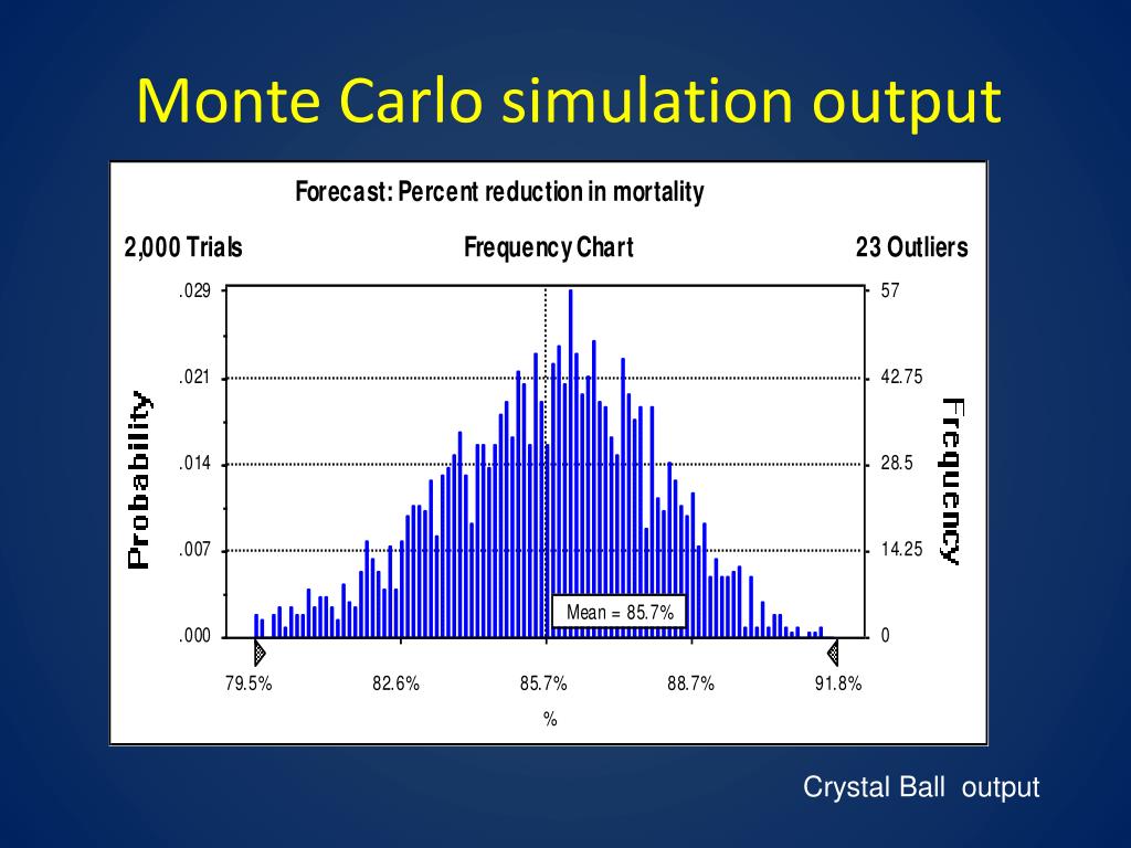 Probabilistic sensitivity analyses • Value • Returns the likelihood of attaining particular • outcome or outcome range. • Everything known about each input expressed all at • once. • Particularly valuable when many inputs important. • Drawback • Need to know, or be able to make decent estimates of, the underlying probability distribution.