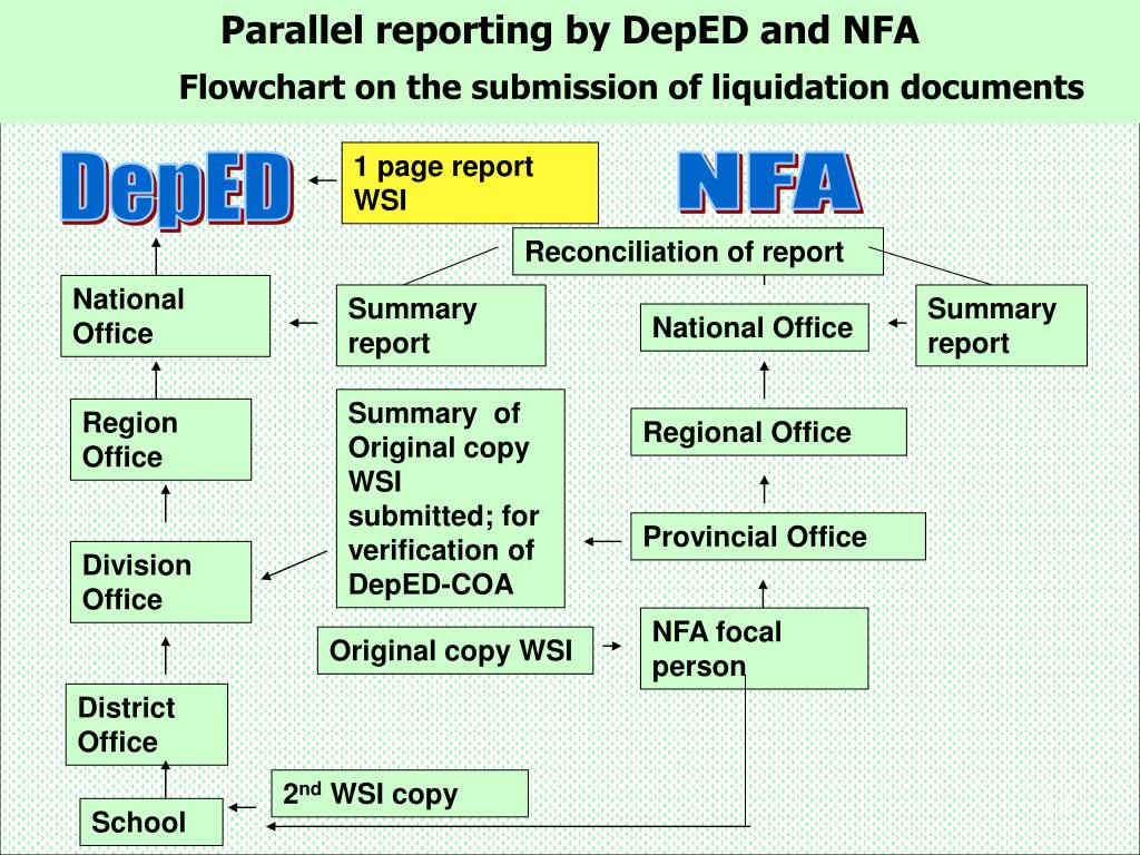 Parallel reporting by DepED and NFA • Flowchart on the submission of liquidation documents 1 page report WSI DepED NFA Reconciliation of report National Office Summary report Summary report National Office Summary of Original copy WSI submitted; for verification of DepED-COA Region Office Regional Office Provincial Office Division Office NFA focal person Original copy WSI District Office 2nd WSI copy School