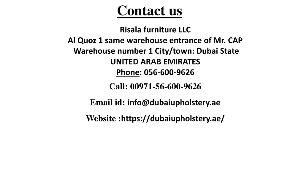 Risala furniture LLC Al Quoz 1 same warehouse entrance of Mr.CAP Warehouse number 1 City/town: Dubai State UNITED ARAB EMIRATES Phone: 056-600-9626 Call: 00971-56-600-9626 Email id: info@dubaiupholstery.ae Website :https://dubaiupholstery.ae/ Contact us