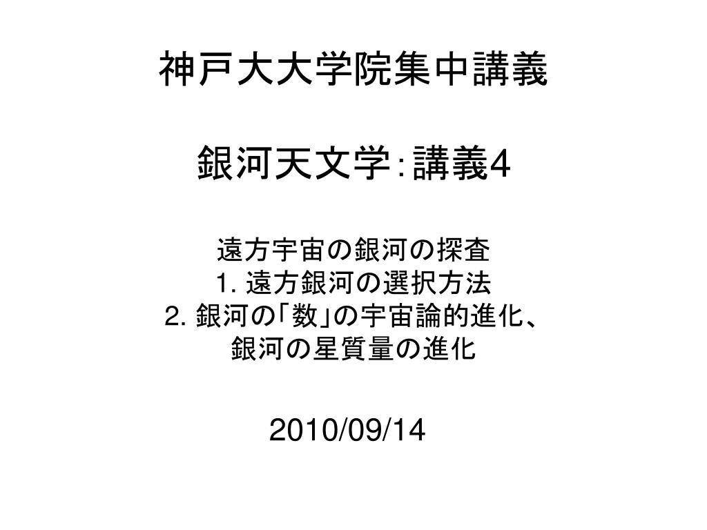 神戸大大学院集中講義銀河天文学:講義4遠方宇宙の銀河の探査1. 遠方銀河の選択方法2. 銀河の「数」の宇宙論的進化、銀河の星質量の進化 2010/09/14