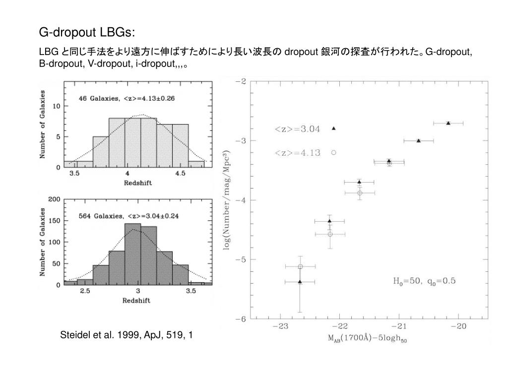 G-dropout LBGs: LBG と同じ手法をより遠方に伸ばすためにより長い波長の dropout 銀河の探査が行われた。G-dropout, B-dropout, V-dropout, i-dropout,,,。 Steidel et al. 1999, ApJ, 519, 1
