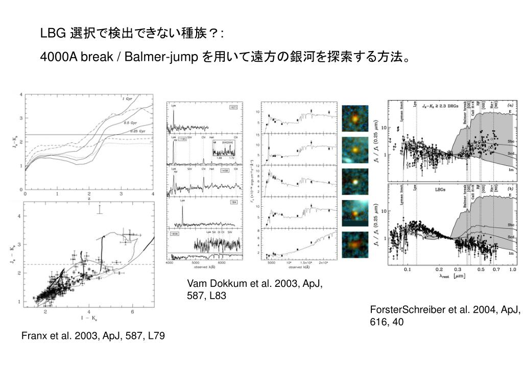 LBG 選択で検出できない種族?: 4000A break / Balmer-jump を用いて遠方の銀河を探索する方法。 Vam Dokkum et al. 2003, ApJ, 587, L83 ForsterSchreiber et al. 2004, ApJ, 616, 40 Franx et al. 2003, ApJ, 587, L79