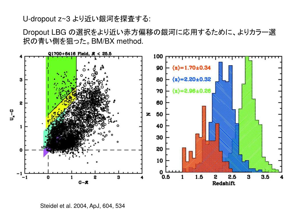 U-dropout z~3 より近い銀河を探査する: Dropout LBG の選択をより近い赤方偏移の銀河に応用するために、よりカラー選択の青い側を狙った。BM/BX method. Steidel et al. 2004, ApJ, 604, 534