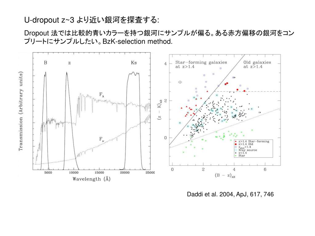 U-dropout z~3 より近い銀河を探査する: Dropout 法では比較的青いカラーを持つ銀河にサンプルが偏る。ある赤方偏移の銀河をコンプリートにサンプルしたい。BzK-selection method. Daddi et al. 2004, ApJ, 617, 746