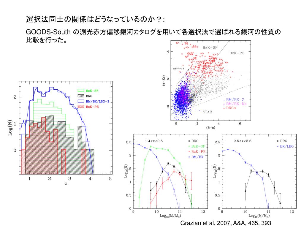 選択法同士の関係はどうなっているのか?: GOODS-South の測光赤方偏移銀河カタログを用いて各選択法で選ばれる銀河の性質の比較を行った。 Grazian et al. 2007, A&A, 465, 393