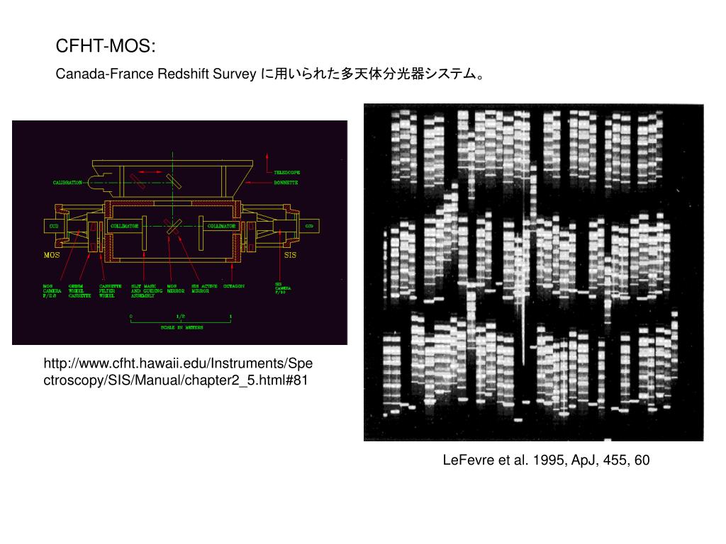 CFHT-MOS: Canada-France Redshift Survey に用いられた多天体分光器システム。 http://www.cfht.hawaii.edu/Instruments/Spectroscopy/SIS/Manual/chapter2_5.html#81 LeFevre et al. 1995, ApJ, 455, 60