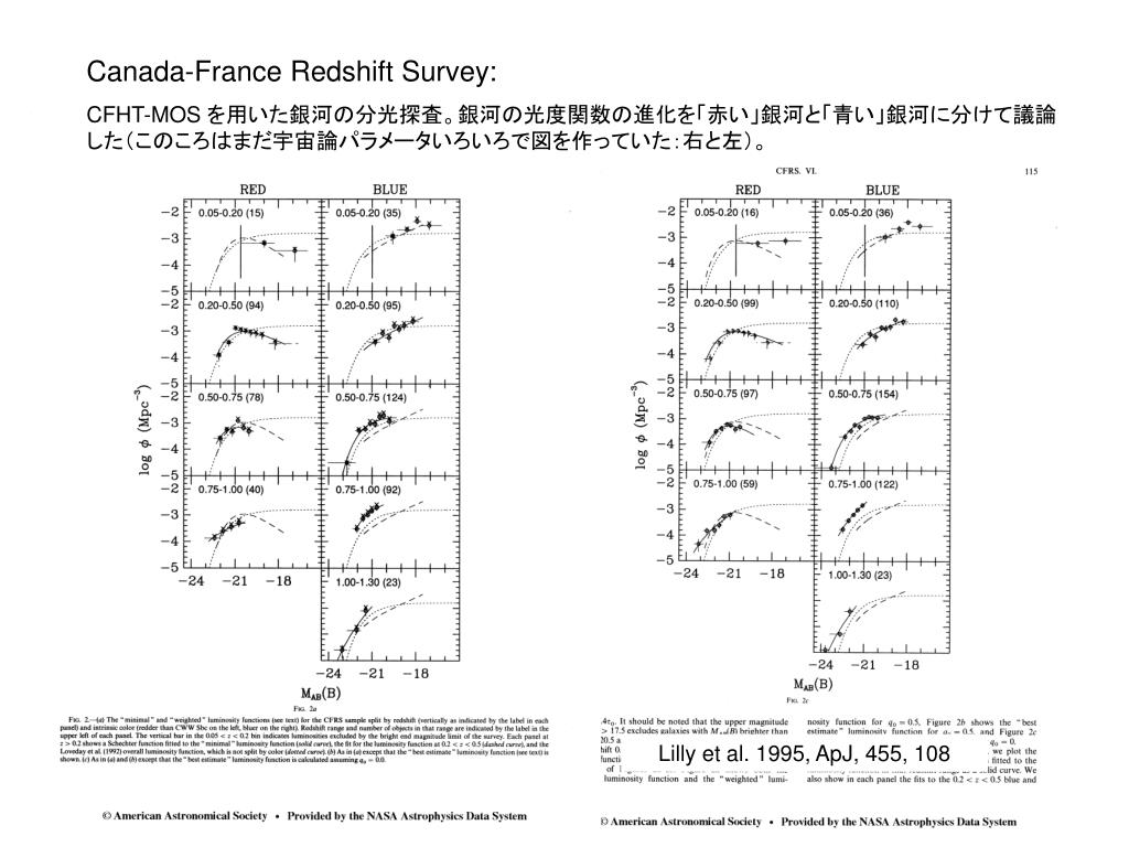 Canada-France Redshift Survey: CFHT-MOS を用いた銀河の分光探査。銀河の光度関数の進化を「赤い」銀河と「青い」銀河に分けて議論した(このころはまだ宇宙論パラメータいろいろで図を作っていた:右と左)。 Lilly et al. 1995, ApJ, 455, 108