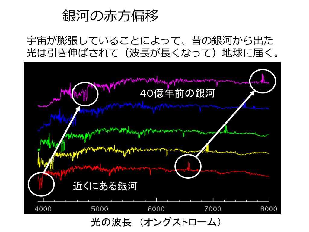 銀河の赤方偏移 宇宙が膨張していることによって、昔の銀河から出た光は引き伸ばされて(波長が長くなって)地球に届く。 40億年前の銀河 近くにある銀河 光の波長 (オングストローム)