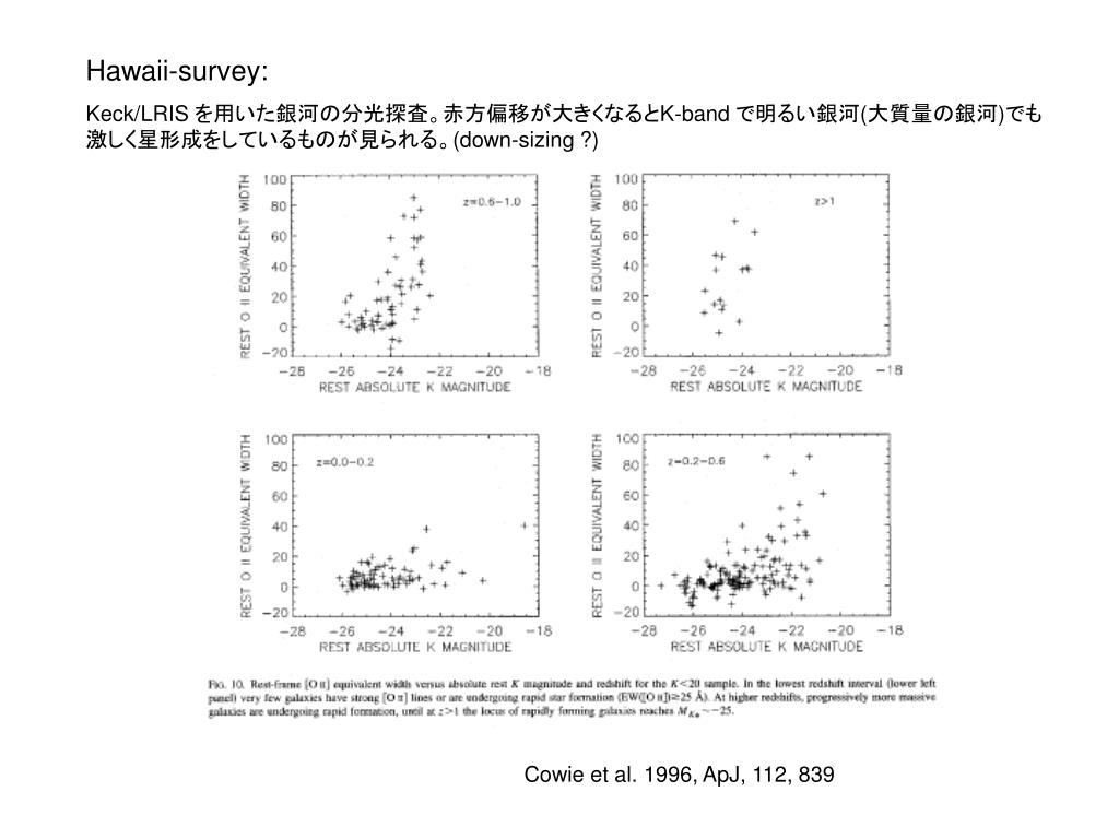 Hawaii-survey: Keck/LRIS を用いた銀河の分光探査。赤方偏移が大きくなるとK-band で明るい銀河(大質量の銀河)でも激しく星形成をしているものが見られる。(down-sizing ?) Cowie et al. 1996, ApJ, 112, 839