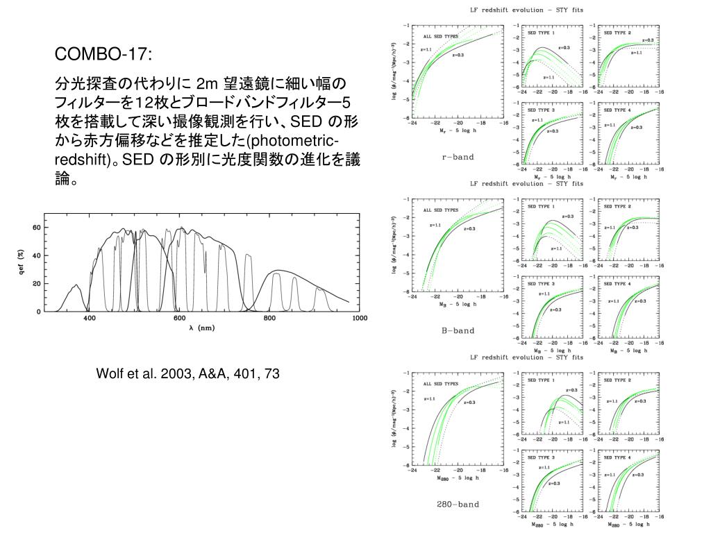 COMBO-17: 分光探査の代わりに 2m 望遠鏡に細い幅のフィルターを12枚とブロードバンドフィルター5枚を搭載して深い撮像観測を行い、SED の形から赤方偏移などを推定した(photometric-redshift)。SED の形別に光度関数の進化を議論。 Wolf et al. 2003, A&A, 401, 73