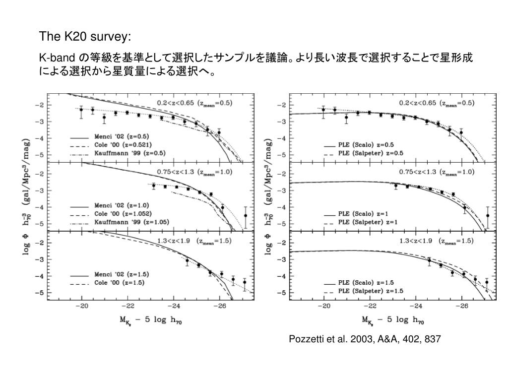 The K20 survey: K-band の等級を基準として選択したサンプルを議論。より長い波長で選択することで星形成による選択から星質量による選択へ。 Pozzetti et al. 2003, A&A, 402, 837