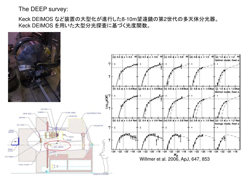 The DEEP survey: Keck DEIMOS など装置の大型化が進行した8-10m望遠鏡の第2世代の多天体分光器。Keck DEIMOS を用いた大型分光探査に基づく光度関数。 Willmer et al. 2006, ApJ, 647, 853