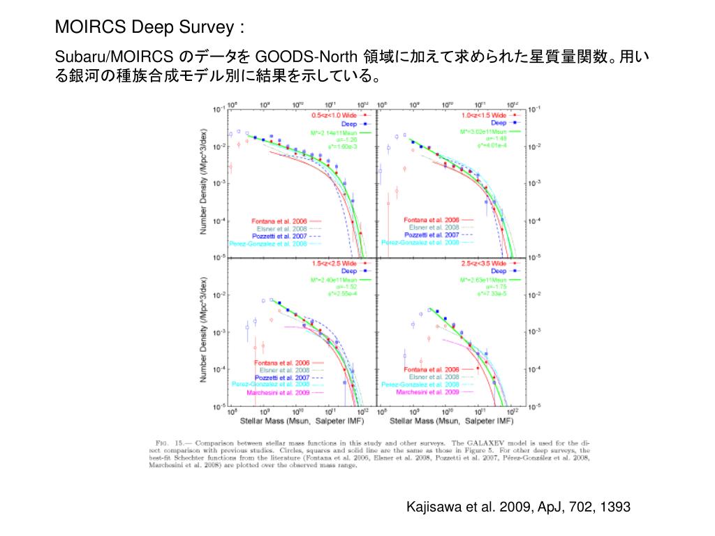 MOIRCS Deep Survey : Subaru/MOIRCS のデータを GOODS-North 領域に加えて求められた星質量関数。用いる銀河の種族合成モデル別に結果を示している。 Kajisawa et al. 2009, ApJ, 702, 1393