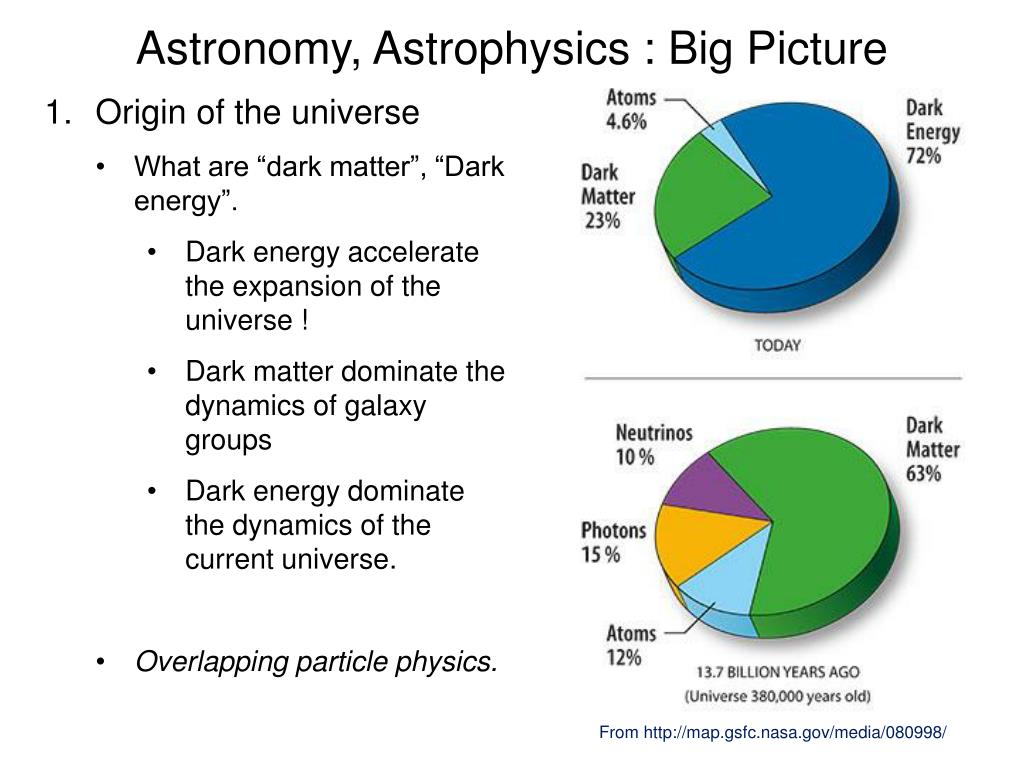 Astronomy, Astrophysics : Big Picture • Origin of the universe • What are “dark matter”, “Dark energy”. • Dark energy accelerate the expansion of the universe ! • Dark matter dominate the dynamics of galaxy groups • Dark energy dominate the dynamics of the current universe. • Overlapping particle physics. From http://map.gsfc.nasa.gov/media/080998/