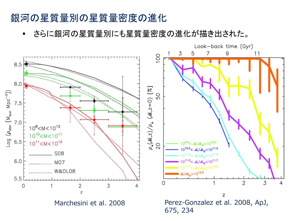 銀河の星質量別の星質量密度の進化 • さらに銀河の星質量別にも星質量密度の進化が描き出された。 Perez-Gonzalez et al. 2008, ApJ, 675, 234 Marchesini et al. 2008