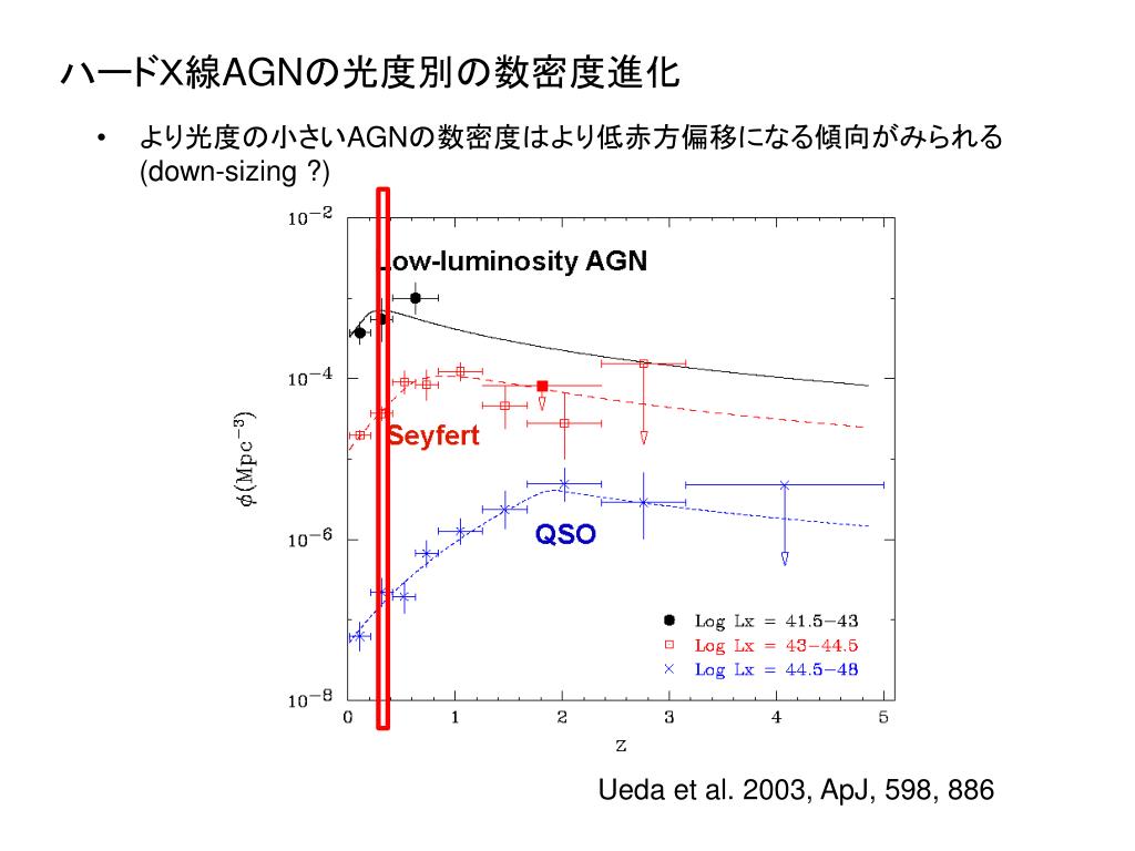ハードX線AGNの光度別の数密度進化 • より光度の小さいAGNの数密度はより低赤方偏移になる傾向がみられる (down-sizing ?) Ueda et al. 2003, ApJ, 598, 886