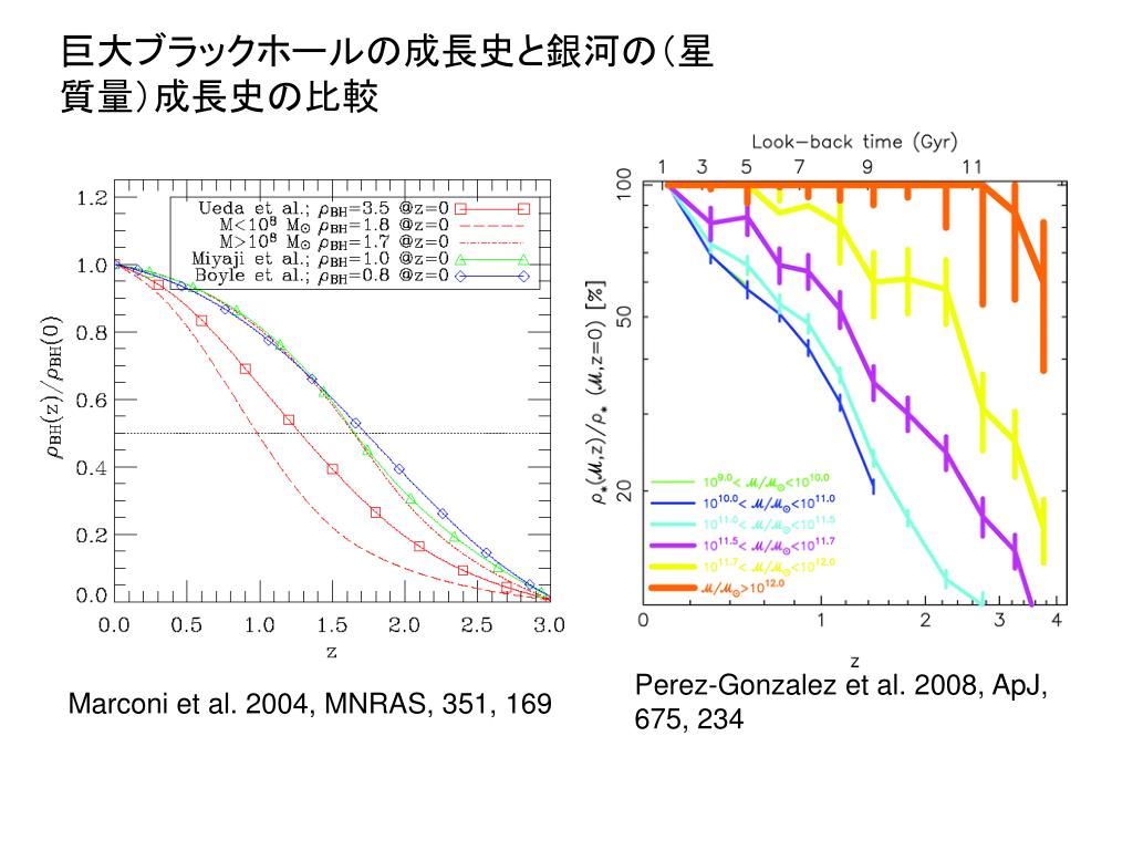 巨大ブラックホールの成長史と銀河の(星質量)成長史の比較巨大ブラックホールの成長史と銀河の(星質量)成長史の比較 Perez-Gonzalez et al. 2008, ApJ, 675, 234 Marconi et al. 2004, MNRAS, 351, 169