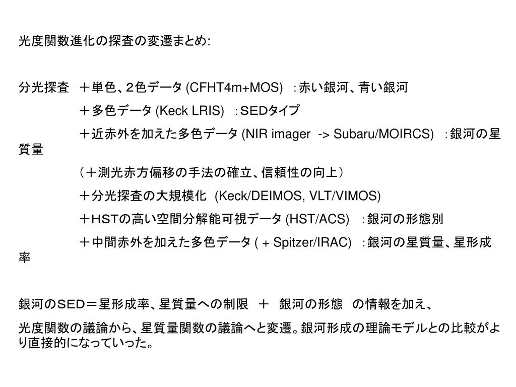 光度関数進化の探査の変遷まとめ: 分光探査 +単色、2色データ (CFHT4m+MOS) :赤い銀河、青い銀河 +多色データ (Keck LRIS) :SEDタイプ +近赤外を加えた多色データ (NIR imager -> Subaru/MOIRCS) :銀河の星質量 (+測光赤方偏移の手法の確立、信頼性の向上) +分光探査の大規模化 (Keck/DEIMOS, VLT/VIMOS) +HSTの高い空間分解能可視データ (HST/ACS) :銀河の形態別 +中間赤外を加えた多色データ ( + Spitzer/IRAC) :銀河の星質量、星形成率 銀河のSED=星形成率、星質量への制限 + 銀河の形態 の情報を加え、 光度関数の議論から、星質量関数の議論へと変遷。銀河形成の理論モデルとの比較がより直接的になっていった。