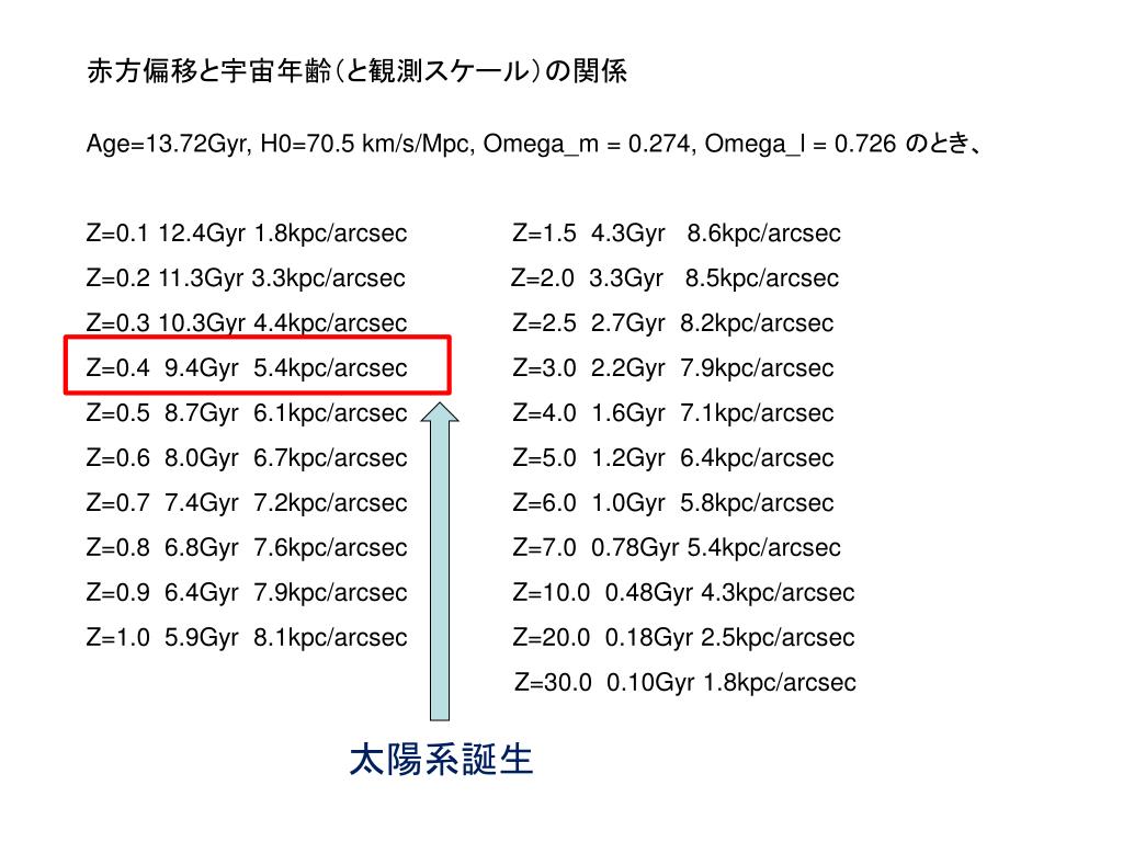 赤方偏移と宇宙年齢(と観測スケール)の関係赤方偏移と宇宙年齢(と観測スケール)の関係 Age=13.72Gyr, H0=70.5 km/s/Mpc, Omega_m = 0.274, Omega_l = 0.726 のとき、 Z=0.1 12.4Gyr 1.8kpc/arcsec Z=1.5 4.3Gyr 8.6kpc/arcsec Z=0.2 11.3Gyr 3.3kpc/arcsec Z=2.0 3.3Gyr 8.5kpc/arcsec Z=0.3 10.3Gyr 4.4kpc/arcsec Z=2.5 2.7Gyr 8.2kpc/arcsec Z=0.4 9.4Gyr 5.4kpc/arcsec Z=3.0 2.2Gyr 7.9kpc/arcsec Z=0.5 8.7Gyr 6.1kpc/arcsec Z=4.0 1.6Gyr 7.1kpc/arcsec Z=0.6 8.0Gyr 6.7kpc/arcsec Z=5.0 1.2Gyr 6.4kpc/arcsec Z=0.7 7.4Gyr 7.2kpc/arcsec Z=6.0 1.0Gyr 5.8kpc/arcsec Z=0.8 6.8Gyr 7.6kpc/arcsec Z=7.0 0.78Gyr 5.4kpc/arcsec Z=0.9 6.4Gyr 7.9kpc/arcsec Z=10.0 0.48Gyr 4.3kpc/arcsec Z=1.0 5.9Gyr 8.1kpc/arcsec Z=20.0 0.18Gyr 2.5kpc/arcsec Z=30.0 0.10Gyr 1.8kpc/arcsec 太陽系誕生