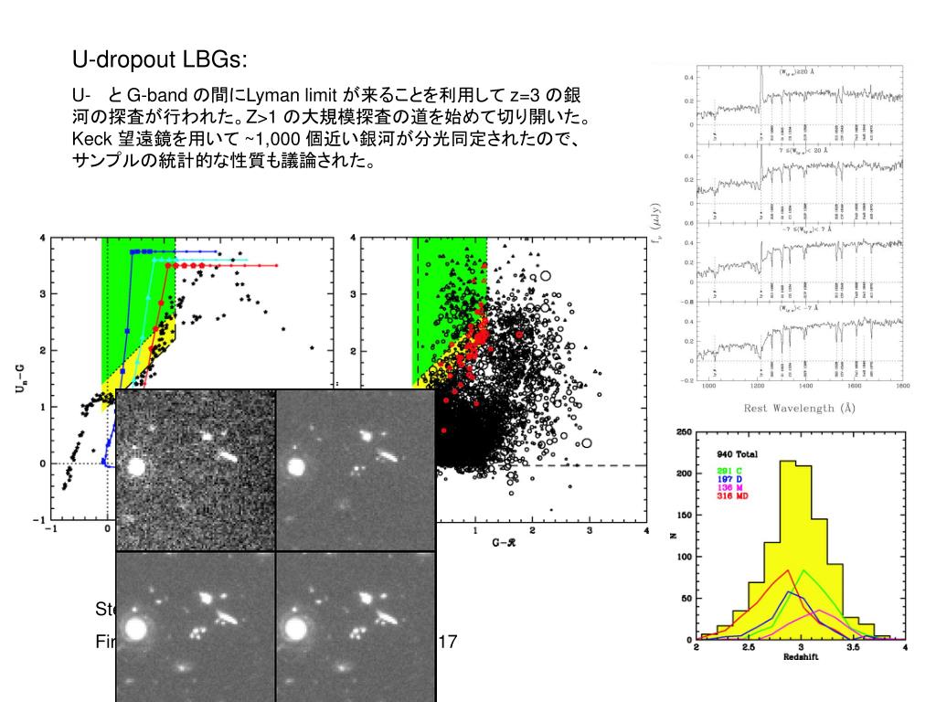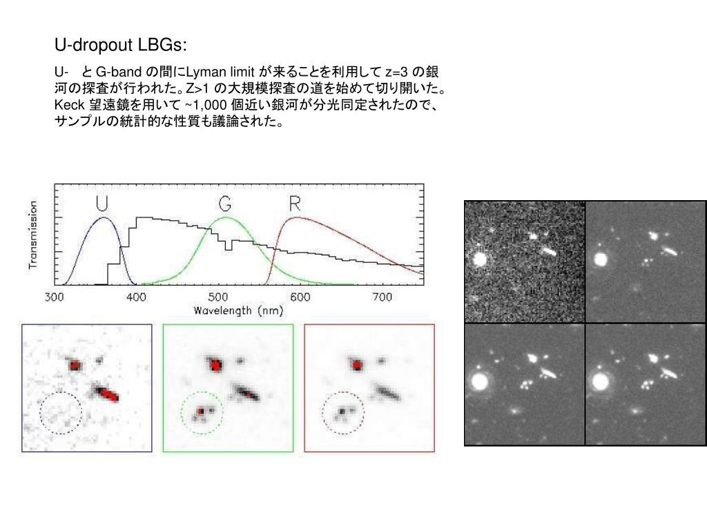 U-dropout LBGs: U- と G-band の間にLyman limit が来ることを利用して z=3 の銀河の探査が行われた。Z>1 の大規模探査の道を始めて切り開いた。Keck 望遠鏡を用いて ~1,000 個近い銀河が分光同定されたので、サンプルの統計的な性質も議論された。