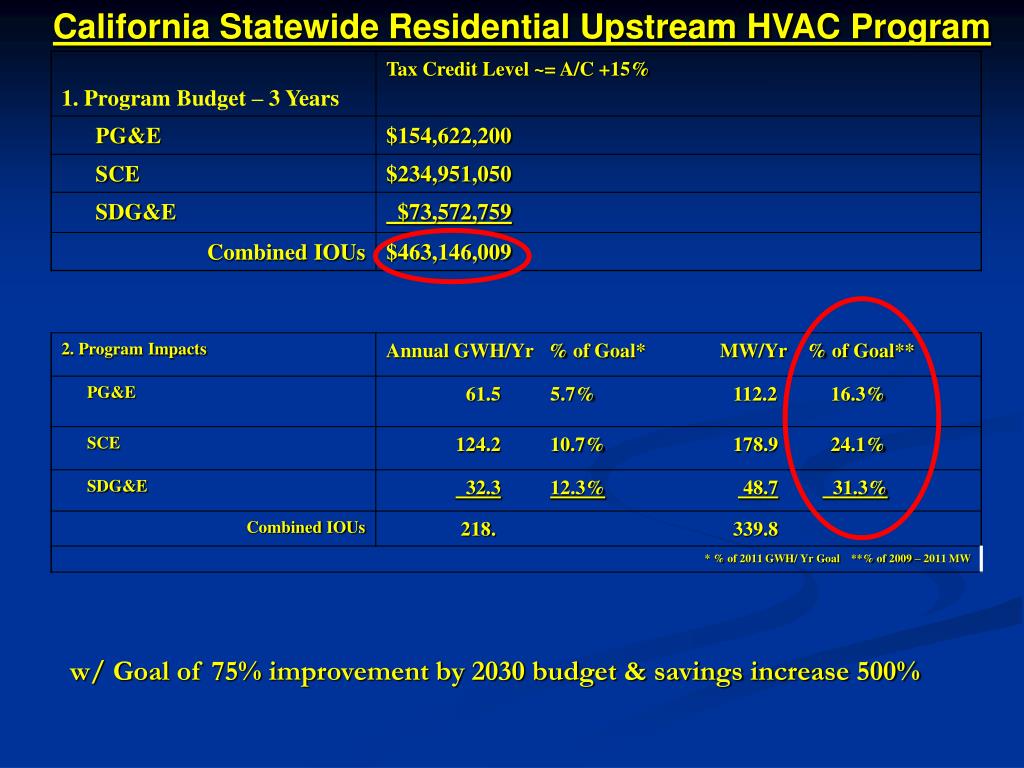 California Statewide Residential Upstream HVAC Program w/ Goal of 75% improvement by 2030 budget & savings increase 500%