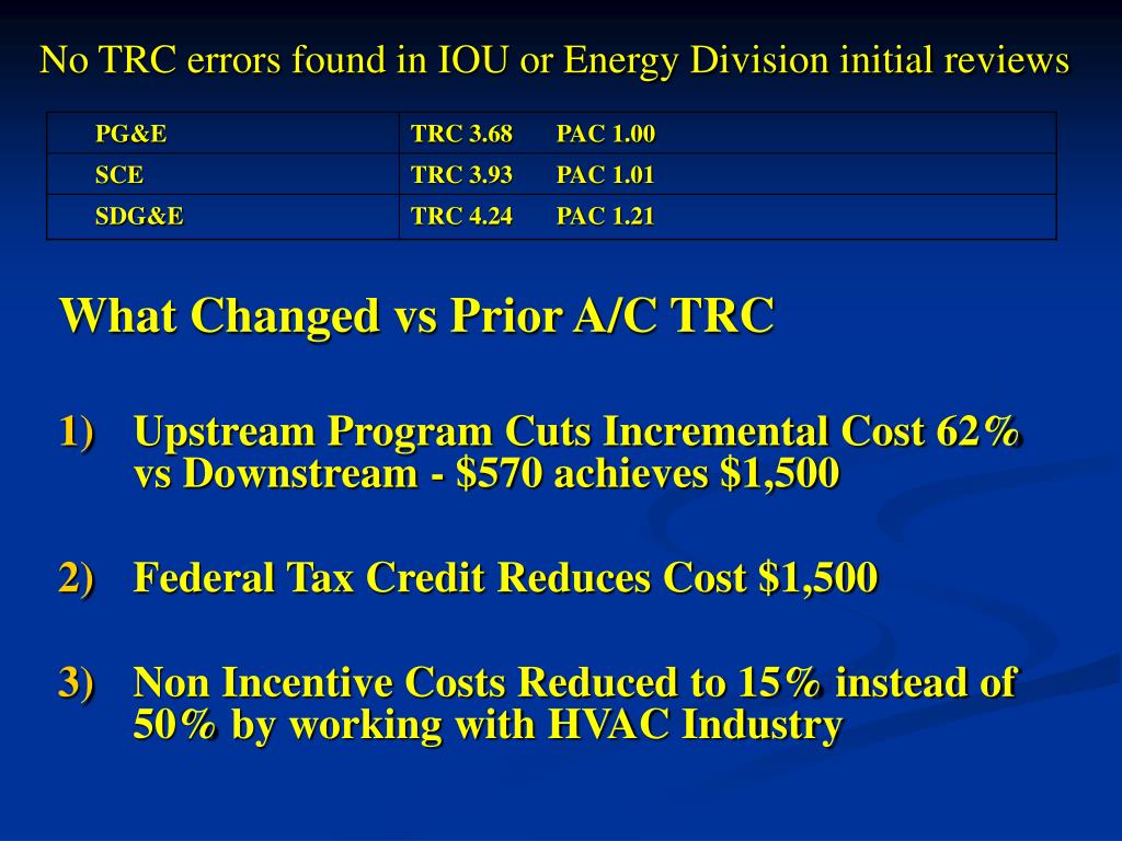 No TRC errors found in IOU or Energy Division initial reviews What Changed vs Prior A/C TRC • Upstream Program Cuts Incremental Cost 62% vs Downstream - $570 achieves $1,500 • Federal Tax Credit Reduces Cost $1,500 • Non Incentive Costs Reduced to 15% instead of 50% by working with HVAC Industry