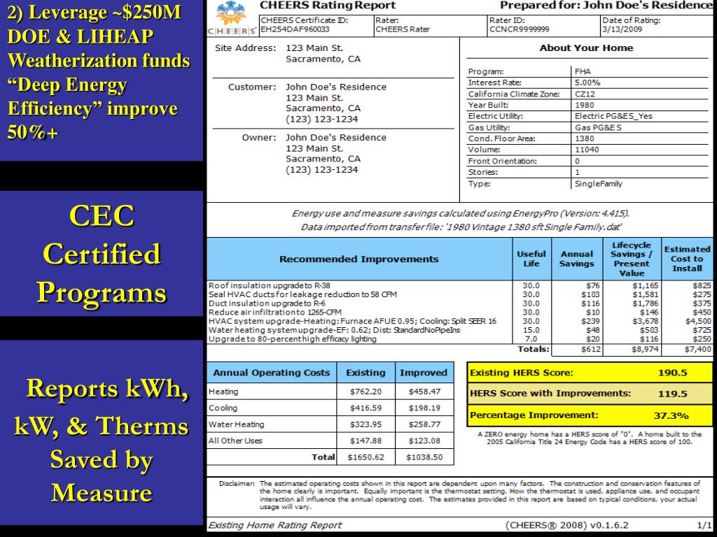 2)Leverage ~$250M DOE & LIHEAP Weatherization funds “Deep Energy Efficiency” improve 50%+ CEC Certified Programs Reports kWh, kW, & Therms Saved by Measure