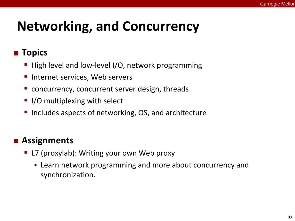 Carnegie Mellon Networking, and Concurrency • Topics • High level and low-level I/O, network programming • Internet services, Web servers • concurrency, concurrent server design, threads • I/O multiplexing with select • Includes aspects of networking, OS, and architecture • Assignments • L7 (proxylab): Writing your own Web proxy • Learn network programming and more about concurrency and synchronization.