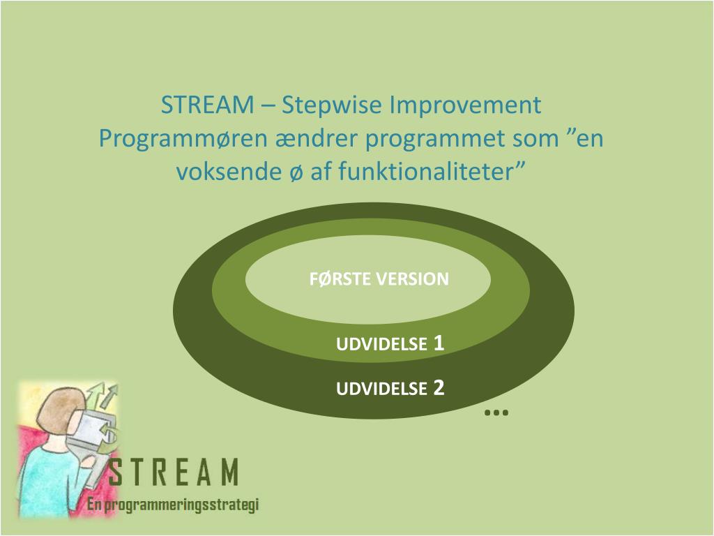 STREAM – StepwiseImprovement Programmøren ændrer programmet som ”en voksende ø af funktionaliteter” FØRSTE VERSION UDVIDELSE 1 UDVIDELSE 2 …