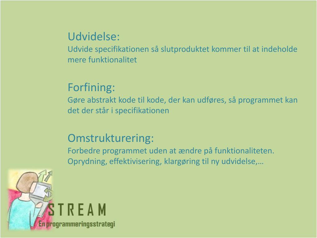 Udvidelse: Udvide specifikationen så slutproduktet kommer til at indeholde mere funktionalitet Forfining: Gøre abstrakt kode til kode, der kan udføres, så programmet kan det der står i specifikationen Omstrukturering: Forbedre programmet uden at ændre på funktionaliteten. Oprydning, effektivisering, klargøring til ny udvidelse,…