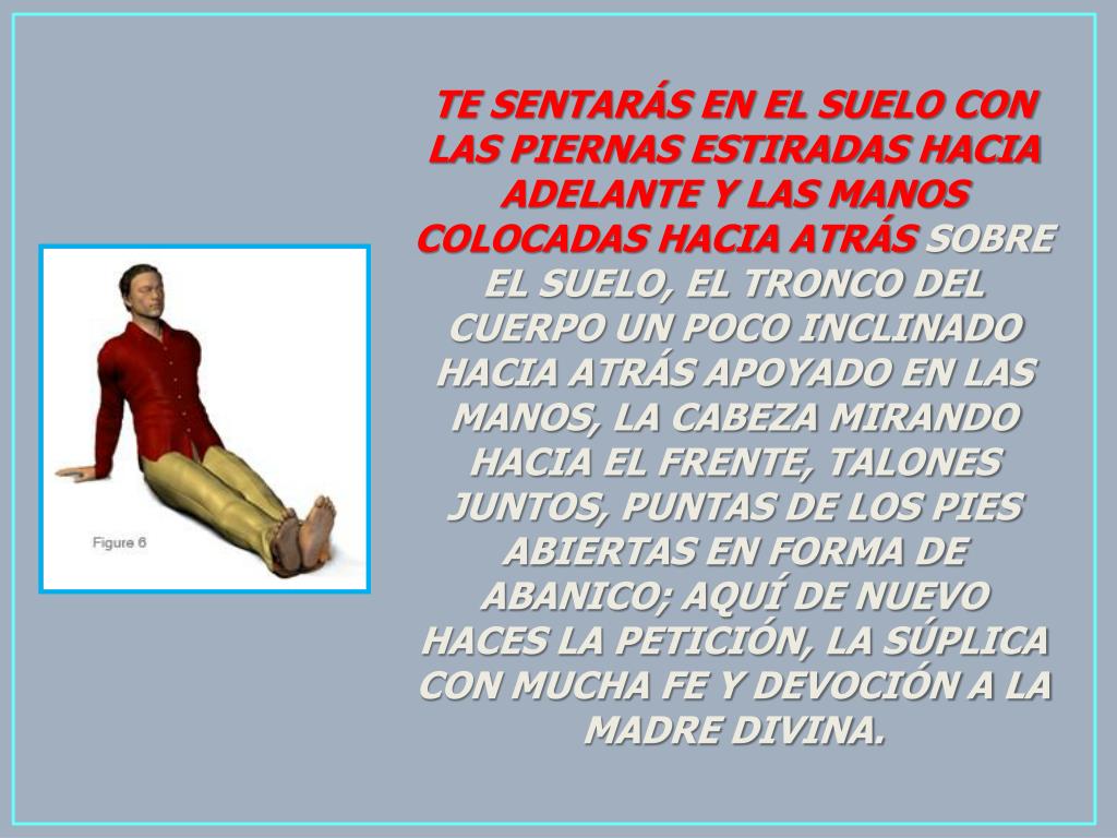TE SENTARÁS EN EL SUELO CON LAS PIERNAS ESTIRADAS HACIA ADELANTE Y LAS MANOS COLOCADAS HACIA ATRÁS SOBRE EL SUELO, EL TRONCO DEL CUERPO UN POCO INCLINADO HACIA ATRÁS APOYADO EN LAS MANOS, LA CABEZA MIRANDO HACIA EL FRENTE, TALONES JUNTOS, PUNTAS DE LOS PIES ABIERTAS EN FORMA DE ABANICO; AQUÍ DE NUEVO HACES LA PETICIÓN, LA SÚPLICA CON MUCHA FE Y DEVOCIÓN A LA MADRE DIVINA.