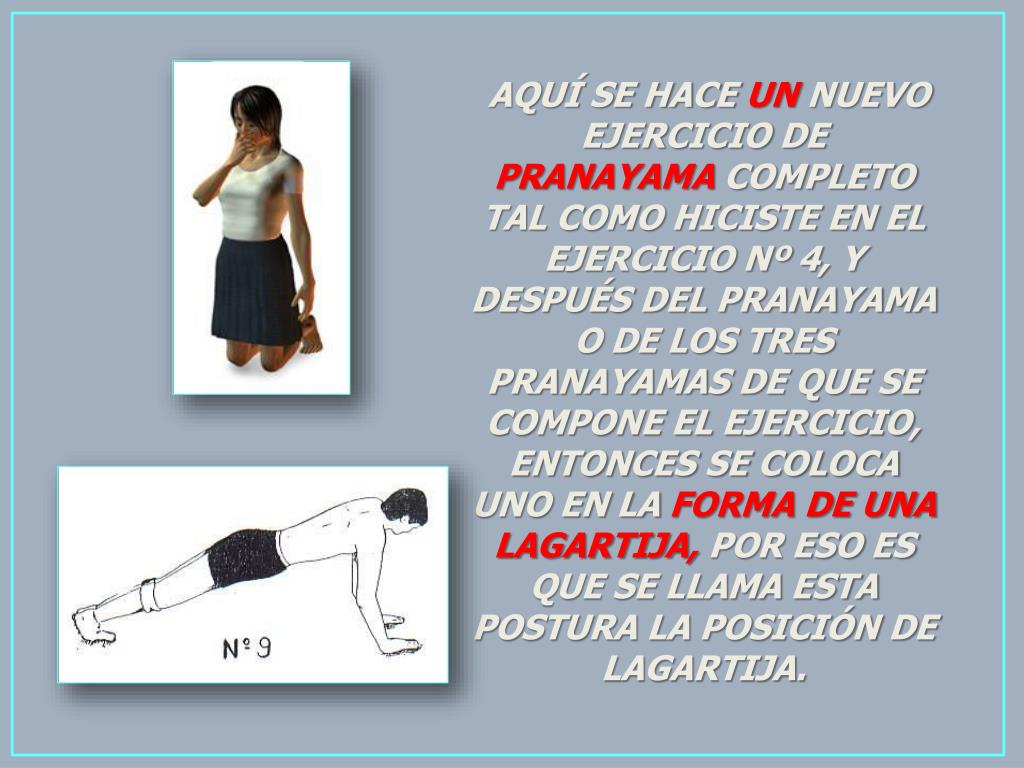 AQUÍ SE HACE UN NUEVO EJERCICIO DE PRANAYAMA COMPLETO TAL COMO HICISTE EN EL EJERCICIO Nº 4, Y DESPUÉS DEL PRANAYAMA O DE LOS TRES PRANAYAMAS DE QUE SE COMPONE EL EJERCICIO, ENTONCES SE COLOCA UNO EN LA FORMA DE UNA LAGARTIJA, POR ESO ES QUE SE LLAMA ESTA POSTURA LA POSICIÓN DE LAGARTIJA.