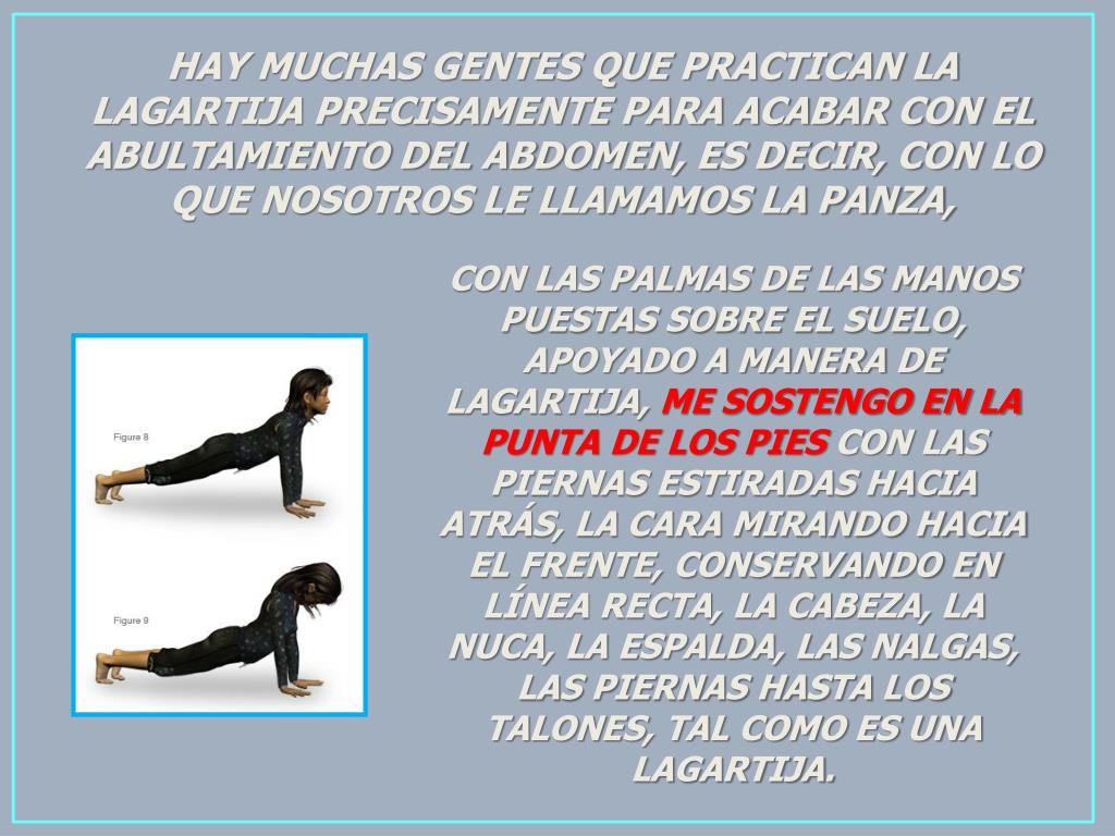 HAY MUCHAS GENTES QUE PRACTICAN LA LAGARTIJA PRECISAMENTE PARA ACABAR CON EL ABULTAMIENTO DEL ABDOMEN, ES DECIR, CON LO QUE NOSOTROS LE LLAMAMOS LA PANZA, CON LAS PALMAS DE LAS MANOS PUESTAS SOBRE EL SUELO, APOYADO A MANERA DE LAGARTIJA, ME SOSTENGO EN LA PUNTA DE LOS PIES CON LAS PIERNAS ESTIRADAS HACIA ATRÁS, LA CARA MIRANDO HACIA EL FRENTE, CONSERVANDO EN LÍNEA RECTA, LA CABEZA, LA NUCA, LA ESPALDA, LAS NALGAS, LAS PIERNAS HASTA LOS TALONES, TAL COMO ES UNA LAGARTIJA.