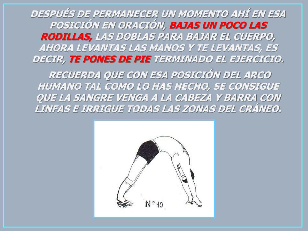 DESPUÉS DE PERMANECER UN MOMENTO AHÍ EN ESA POSICIÓN EN ORACIÓN, BAJAS UN POCO LAS RODILLAS, LAS DOBLAS PARA BAJAR EL CUERPO, AHORA LEVANTAS LAS MANOS Y TE LEVANTAS, ES DECIR, TE PONES DE PIE TERMINADO EL EJERCICIO. RECUERDA QUE CON ESA POSICIÓN DEL ARCO HUMANO TAL COMO LO HAS HECHO, SE CONSIGUE QUE LA SANGRE VENGA A LA CABEZA Y BARRA CON LINFAS E IRRIGUE TODAS LAS ZONAS DEL CRÁNEO.