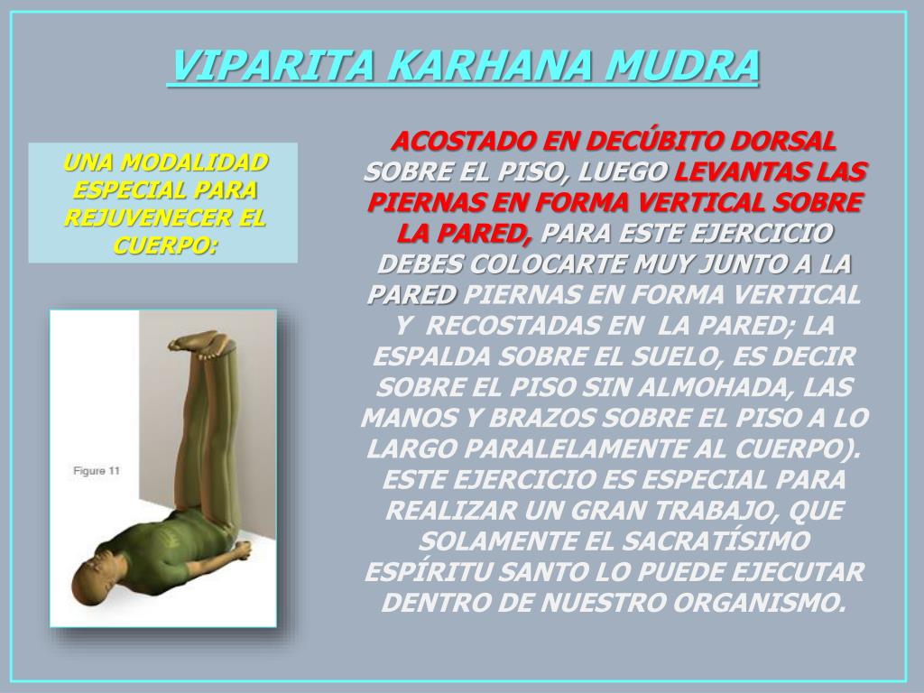 VIPARITA KARHANAMUDRA ACOSTADO EN DECÚBITO DORSAL SOBRE EL PISO, LUEGO LEVANTAS LAS PIERNAS EN FORMA VERTICAL SOBRE LA PARED, PARA ESTE EJERCICIO DEBES COLOCARTE MUY JUNTO A LA PAREDPIERNAS EN FORMA VERTICAL Y RECOSTADAS EN LA PARED; LA ESPALDA SOBRE EL SUELO, ES DECIR SOBRE EL PISO SIN ALMOHADA, LAS MANOS Y BRAZOS SOBRE EL PISO A LO LARGO PARALELAMENTE AL CUERPO). ESTE EJERCICIO ES ESPECIAL PARA REALIZAR UN GRAN TRABAJO, QUE SOLAMENTE EL SACRATÍSIMO ESPÍRITU SANTO LO PUEDE EJECUTAR DENTRO DE NUESTRO ORGANISMO. UNA MODALIDAD ESPECIAL PARA REJUVENECER EL CUERPO: