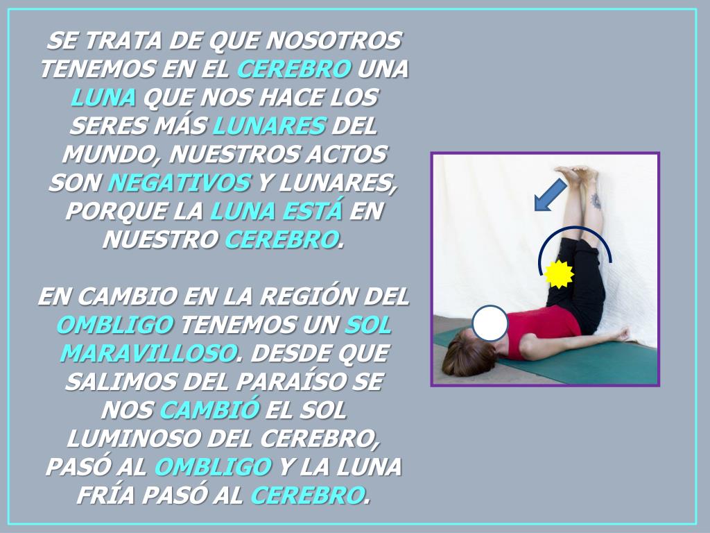 SE TRATA DE QUE NOSOTROS TENEMOS EN EL CEREBRO UNA LUNA QUE NOS HACE LOS SERES MÁS LUNARES DEL MUNDO, NUESTROS ACTOS SON NEGATIVOS Y LUNARES, PORQUE LA LUNAESTÁ EN NUESTRO CEREBRO. EN CAMBIO EN LA REGIÓN DEL OMBLIGO TENEMOS UN SOLMARAVILLOSO. DESDE QUE SALIMOS DEL PARAÍSO SE NOS CAMBIÓ EL SOL LUMINOSO DEL CEREBRO, PASÓ AL OMBLIGO Y LA LUNA FRÍA PASÓ AL CEREBRO.