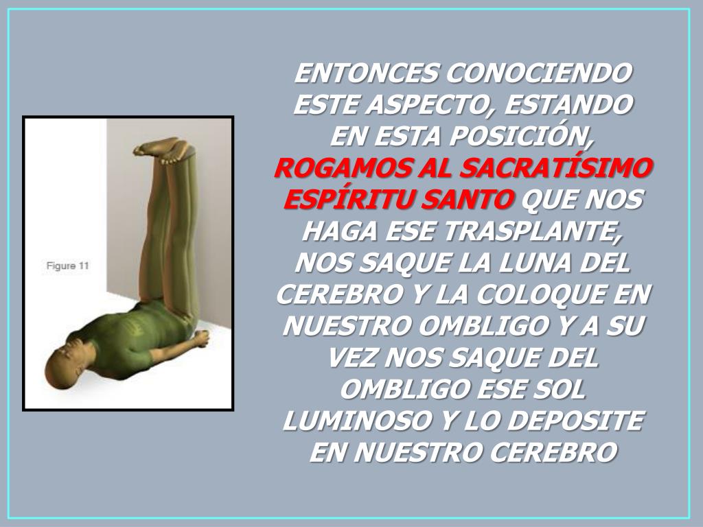 ENTONCES CONOCIENDO ESTE ASPECTO, ESTANDO EN ESTA POSICIÓN, ROGAMOS AL SACRATÍSIMO ESPÍRITU SANTO QUE NOS HAGA ESE TRASPLANTE, NOS SAQUE LA LUNA DEL CEREBRO Y LA COLOQUE EN NUESTRO OMBLIGO Y A SU VEZ NOS SAQUE DEL OMBLIGO ESE SOL LUMINOSO Y LO DEPOSITE EN NUESTRO CEREBRO