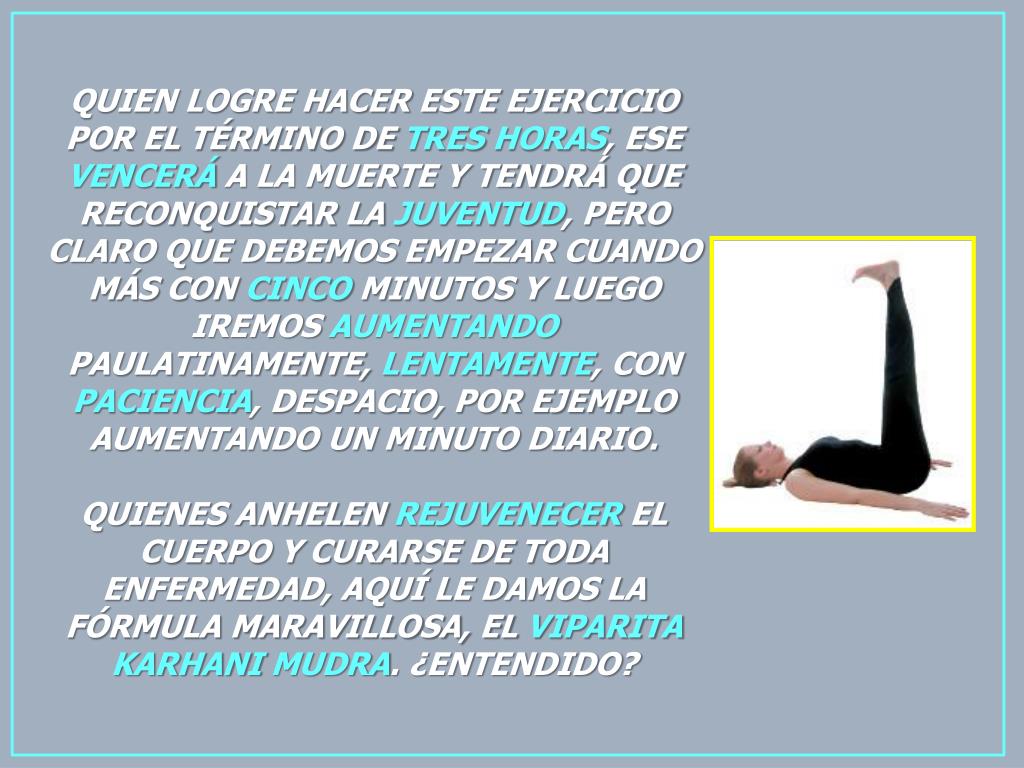 QUIEN LOGRE HACER ESTE EJERCICIO POR EL TÉRMINO DE TRESHORAS, ESE VENCERÁ A LA MUERTE Y TENDRÁ QUE RECONQUISTAR LA JUVENTUD, PERO CLARO QUE DEBEMOS EMPEZAR CUANDO MÁS CON CINCO MINUTOS Y LUEGO IREMOS AUMENTANDO PAULATINAMENTE, LENTAMENTE, CON PACIENCIA, DESPACIO, POR EJEMPLO AUMENTANDO UN MINUTO DIARIO. QUIENES ANHELEN REJUVENECER EL CUERPO Y CURARSE DE TODA ENFERMEDAD, AQUÍ LE DAMOS LA FÓRMULA MARAVILLOSA, EL VIPARITAKARHANIMUDRA. ¿ENTENDIDO?