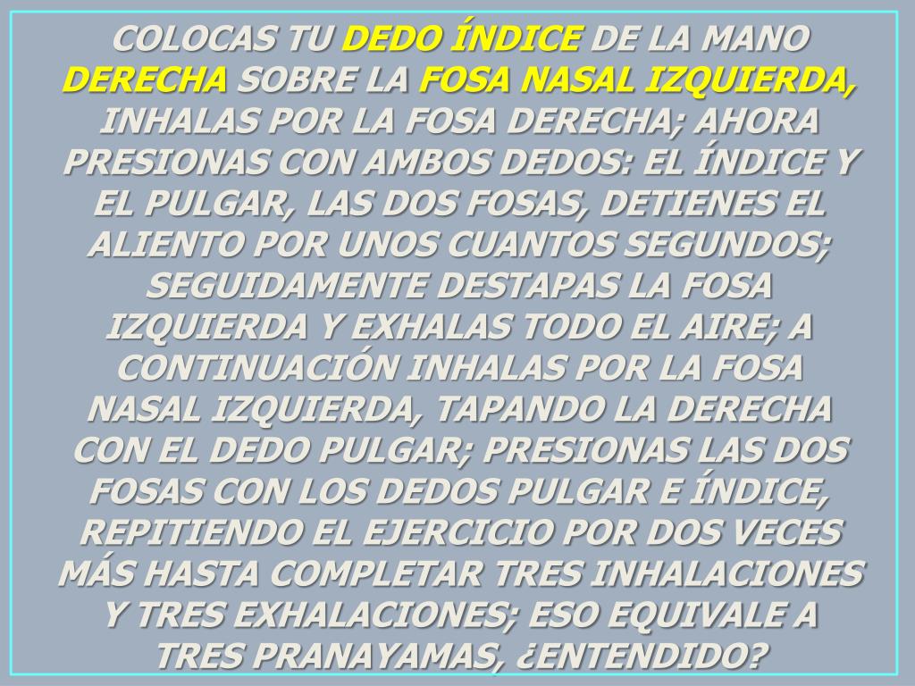 COLOCAS TU DEDOÍNDICEDE LA MANO DERECHASOBRE LA FOSANASALIZQUIERDA,INHALAS POR LA FOSA DERECHA; AHORA PRESIONAS CON AMBOS DEDOS: EL ÍNDICE Y EL PULGAR, LAS DOS FOSAS, DETIENES EL ALIENTO POR UNOS CUANTOS SEGUNDOS; SEGUIDAMENTE DESTAPAS LA FOSA IZQUIERDA Y EXHALAS TODO EL AIRE; A CONTINUACIÓN INHALAS POR LA FOSA NASAL IZQUIERDA, TAPANDO LA DERECHA CON EL DEDO PULGAR; PRESIONAS LAS DOS FOSAS CON LOS DEDOS PULGAR E ÍNDICE, REPITIENDO EL EJERCICIO POR DOS VECES MÁS HASTA COMPLETAR TRES INHALACIONES Y TRES EXHALACIONES; ESO EQUIVALE A TRES PRANAYAMAS, ¿ENTENDIDO?