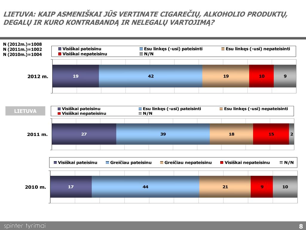 LIETUVA: KAIP ASMENIŠKAI JŪS VERTINATE CIGAREČIŲ, ALKOHOLIO PRODUKTŲ, DEGALŲ IR KURO KONTRABANDĄ IR NELEGALŲ VARTOJIMĄ? N (2012m.)=1008 N (2011m.)=1002 N (2010m.)=1004 LIETUVA 8
