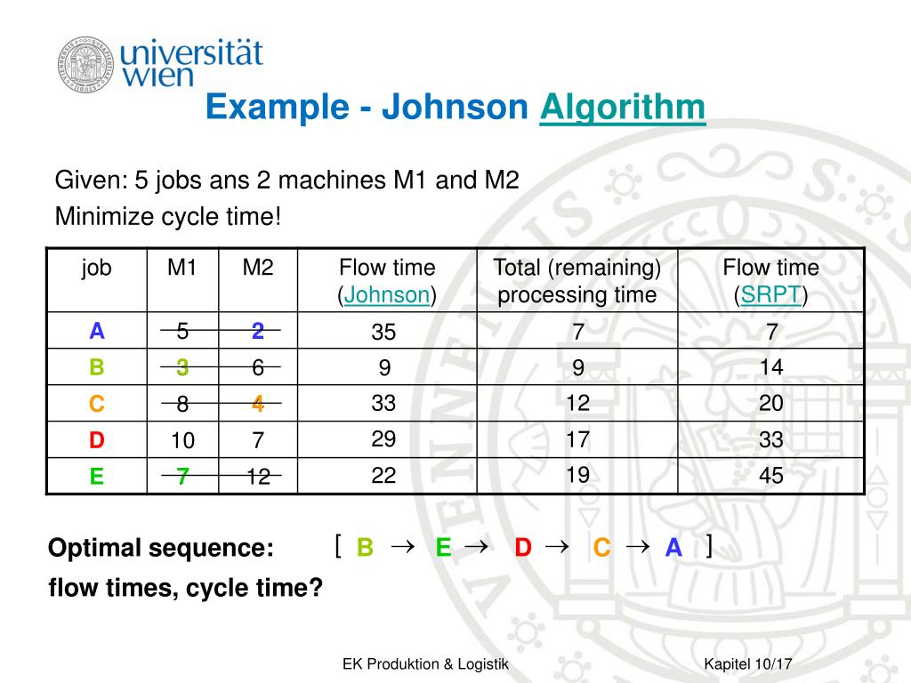 Example - Johnson Algorithm Given: 5 jobs ans 2 machines M1 and M2 Minimize cycle time! 2 35 7 7 14 3 9 9 33 12 20 4 29 17 33 19 22 45 7 [ ] Optimal sequence: B E D C A flowtimes, cycle time? EK Produktion & Logistik Kapitel 10/17