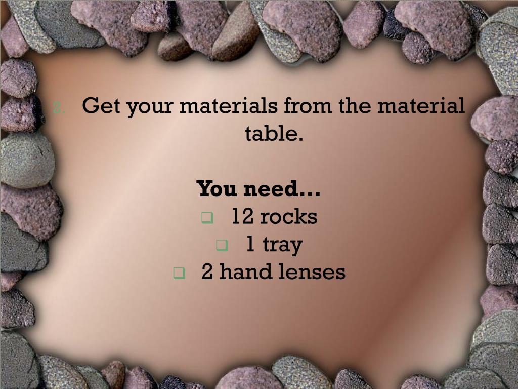 Get your materials from the material table. You need… • 12 rocks • 1 tray • 2 hand lenses