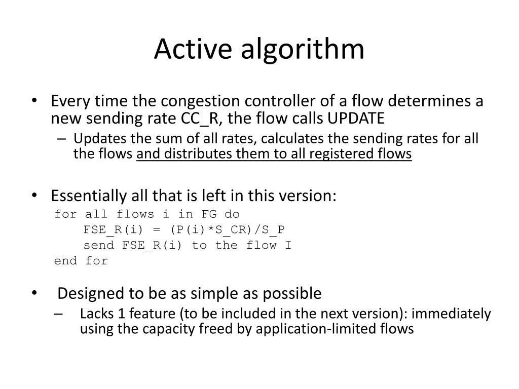 Active algorithm • Every time the congestion controller of a flow determines a new sending rate CC_R, the flow calls UPDATE • Updates the sum of all rates, calculates the sending rates for all the flows and distributes them to all registered flows • Essentially all that is left in this version: for all flows i in FG do FSE_R(i) = (P(i)*S_CR)/S_P send FSE_R(i) to the flow I end for • Designed to be as simple as possible • Lacks 1 feature (to be included in the next version): immediately using the capacity freed by application-limited flows
