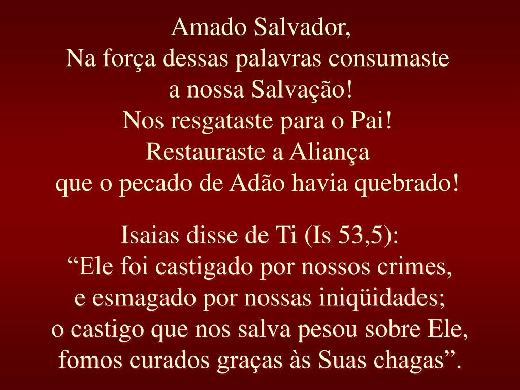 Amado Salvador, Na força dessas palavras consumaste a nossa Salvação! Nos resgataste para o Pai! Restauraste a Aliança que o pecado de Adão havia quebrado! Isaias disse de Ti (Is 53,5): “Ele foi castigado por nossos crimes, e esmagado por nossas iniqüidades; o castigo que nos salva pesou sobre Ele, fomos curados graças às Suas chagas”.