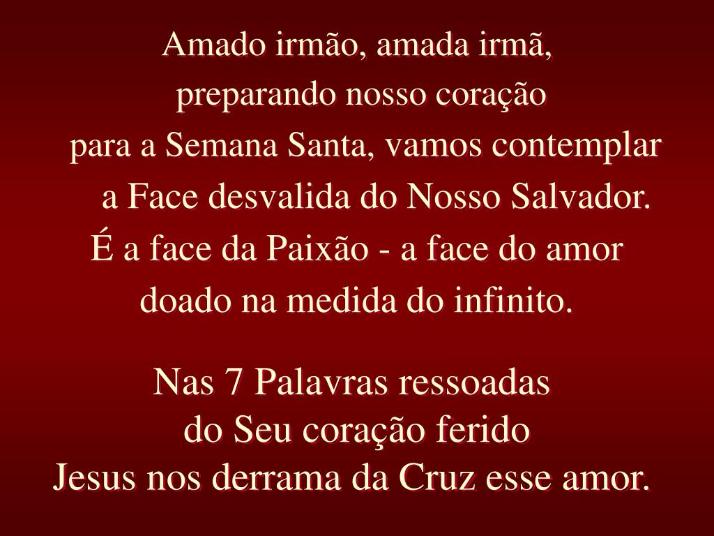 Amado irmão, amada irmã, preparando nosso coração para a Semana Santa, vamos contemplar a Face desvalida do Nosso Salvador. É a face da Paixão - a face do amor doado na medida do infinito. Nas 7 Palavras ressoadas do Seu coração ferido Jesus nos derrama da Cruz esse amor.