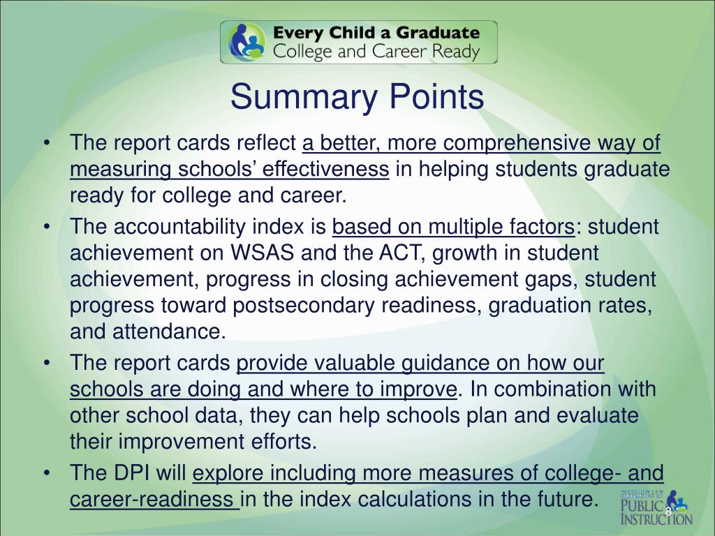 Summary Points • The report cards reflect a better, more comprehensive way of measuring schools’ effectiveness in helping students graduate ready for college and career. • The accountability index is based on multiple factors: student achievement on WSAS and the ACT, growth in student achievement, progress in closing achievement gaps, student progress toward postsecondary readiness, graduation rates, and attendance. • The report cards provide valuable guidance on how our schools are doing and where to improve. In combination with other school data, they can help schools plan and evaluate their improvement efforts. • The DPI will explore including more measures of college- and career-readiness in the index calculations in the future.