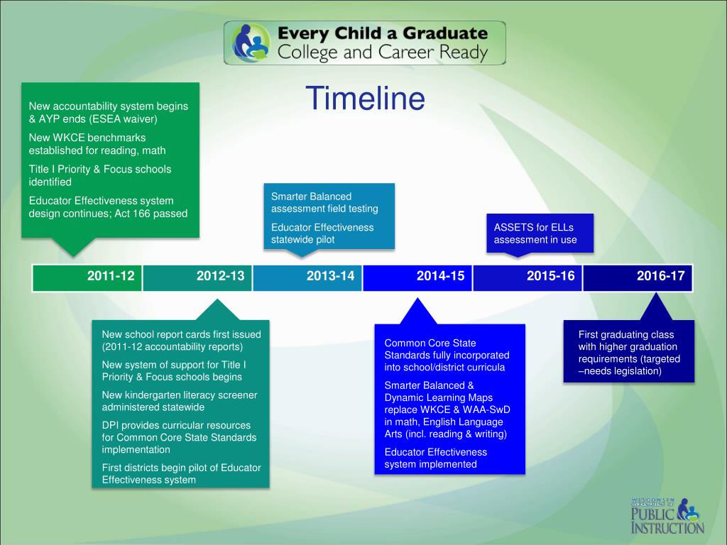 Timeline New accountability system begins & AYP ends (ESEA waiver) New WKCE benchmarks established for reading, math Title I Priority & Focus schools identified Educator Effectiveness system design continues; Act 166 passed Smarter Balanced assessment field testing Educator Effectiveness statewide pilot ASSETS for ELLs assessment in use New school report cards first issued (2011-12 accountability reports) New system of support for Title I Priority & Focus schools begins New kindergarten literacy screeneradministered statewide DPI provides curricular resources for Common Core State Standards implementation First districts begin pilot of Educator Effectiveness system First graduating class with higher graduation requirements (targeted –needs legislation) Common Core State Standards fully incorporated into school/district curricula Smarter Balanced & Dynamic Learning Maps replace WKCE & WAA-SwD in math, English Language Arts (incl. reading & writing) Educator Effectiveness system implemented