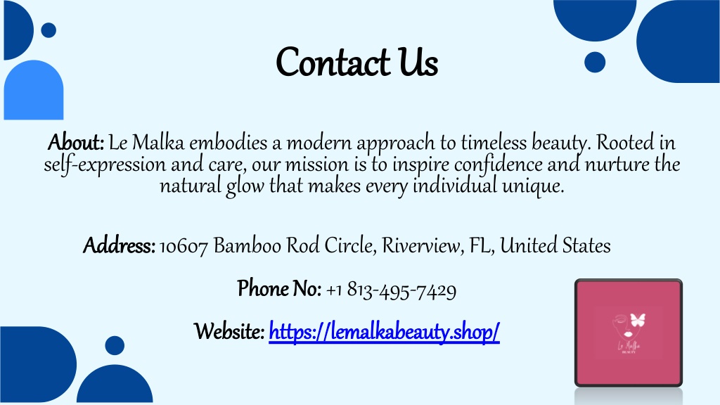 4. Contact Us About: Le Malka embodies a modern approach to timeless beauty. Rooted in self-expression and care, our mission is to inspire confidence and nurture the natural glow that makes every individual unique. Address: 10607 Bamboo Rod Circle, Riverview, FL, United States Phone No: +1 813-495-7429 Website: https://lemalkabeauty.shop/