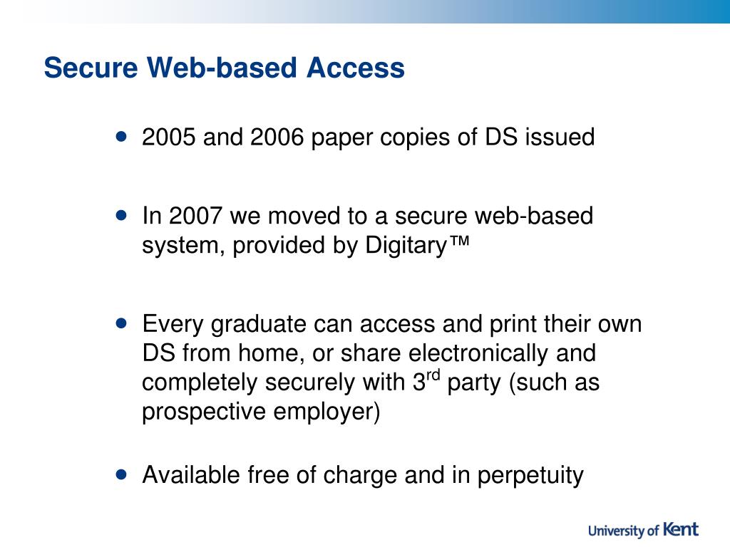 Secure Web-based Access • 2005 and 2006 paper copies of DS issued • In 2007 we moved to a secure web-based system, provided by Digitary™ • Every graduate can access and print their own DS from home, or share electronically and completely securely with 3rd party (such as prospective employer) • Available free of charge and in perpetuity