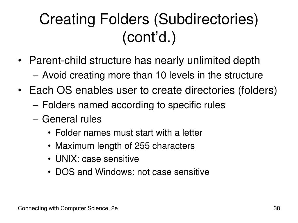 Creating Folders (Subdirectories) (cont’d.) • Parent-child structure has nearly unlimited depth • Avoid creating more than 10 levels in the structure • Each OS enables user to create directories (folders) • Folders named according to specific rules • General rules • Folder names must start with a letter • Maximum length of 255 characters • UNIX: case sensitive • DOS and Windows: not case sensitive Connecting with Computer Science, 2e